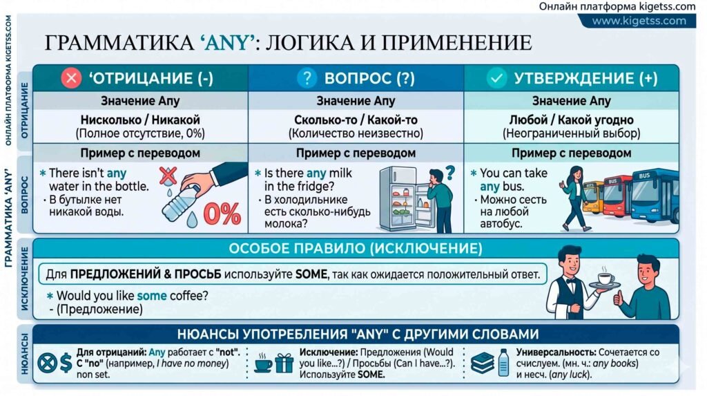 Местоимение any часто называют «хамелеоном» английского языка. Его значение и логика использования напрямую зависят от типа предложения. Важно уловить главный принцип: any указывает на неопределенное количество или отсутствие границ выбора.