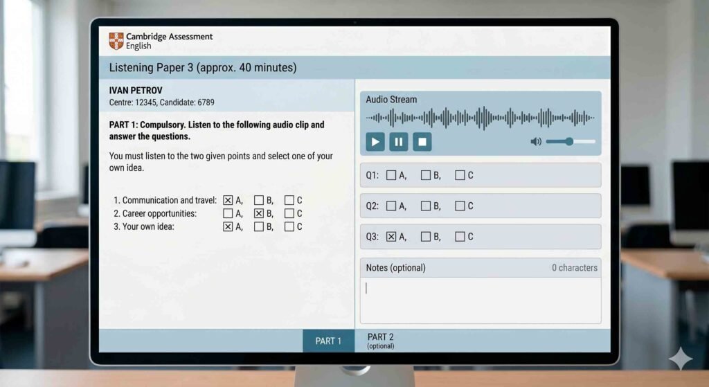 Listening: Каждый кандидат сдает в индивидуальных наушниках и может самостоятельно регулировать громкость. Это избавляет от проблем с акустикой в помещении.
