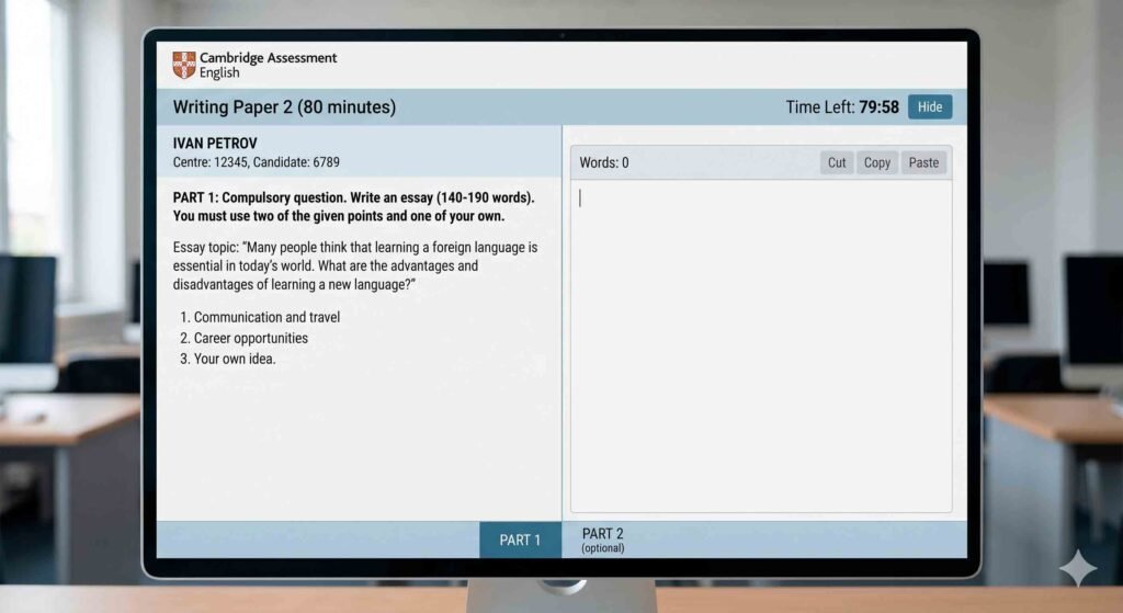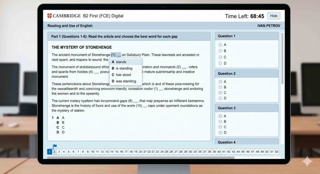1. Reading & Use of English В верхней части экрана всегда отображается обратный отсчет. Ответы сохраняются автоматически в момент клика. Важно: В компьютерной версии полностью отсутствует время на перенос ответов в конце (в бумажном варианте его тоже официально нет, но там иногда удается «дописывать», пока собирают бланки). Здесь система заблокируется ровно через 75 минут.