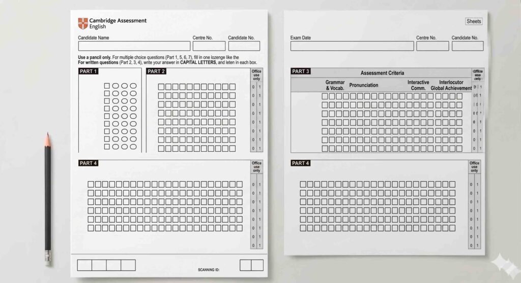 Правая часть (Assessment Criteria): Это самая важная зона. В ней расположены сетки (клеточки и кружки) для выставления баллов по ключевым критериям B2 First: